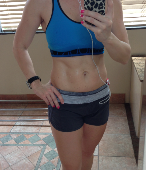 I told him I guessed I was at 18% body fat. He took the measurements and said he'd text me after he calculated it so we could get right to working out. But, based on the measurements he just took, H most of my fat is in my stomach, lower back, and calves. Later that day, I did my ab routine and 30 minutes of cardio. Afterwards, I snapped a pic of my abs as they were looking pretty good right then.